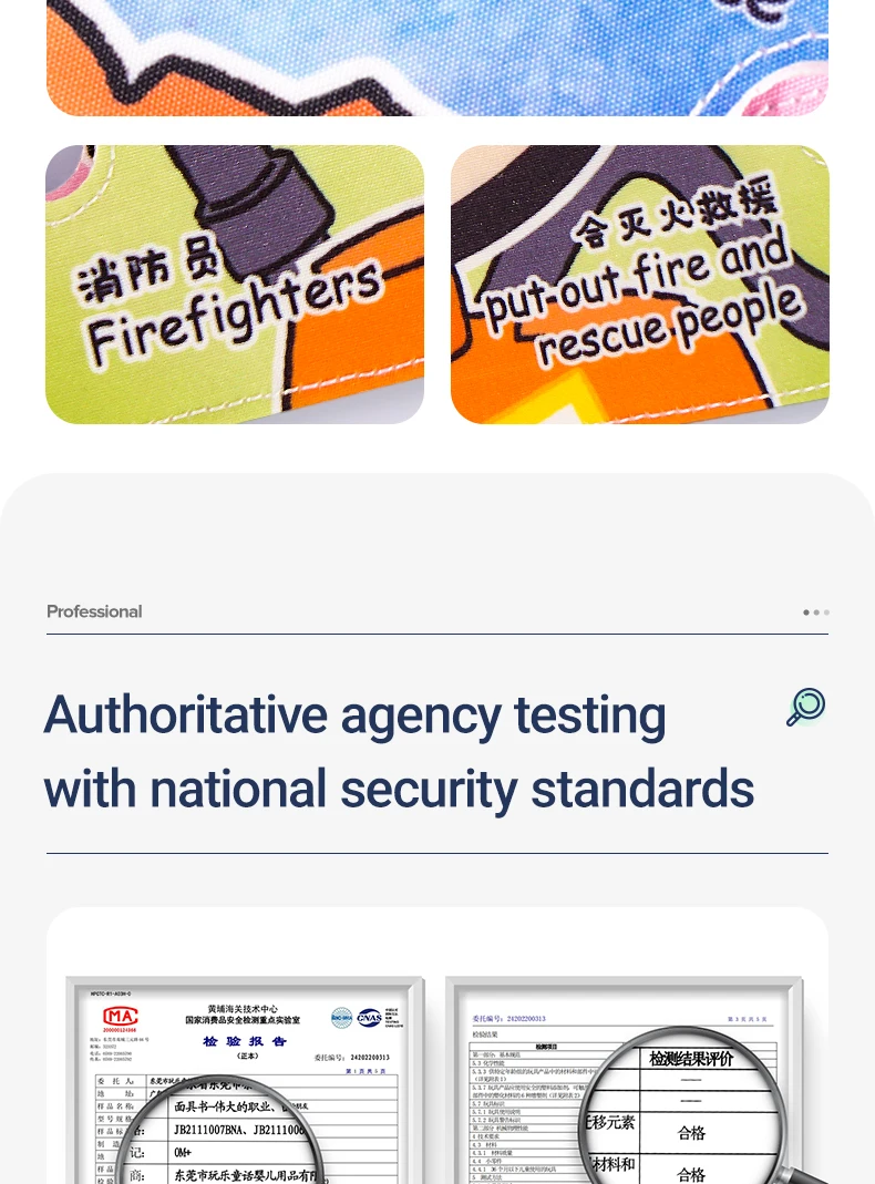 Insisting on using premium eco-friendly materials and observing strict toy manufacturing process & standards, our standards meet with different countries' requirements: ISO9001, GB 6675-2014, EN-71 and ASTM F963-96A.