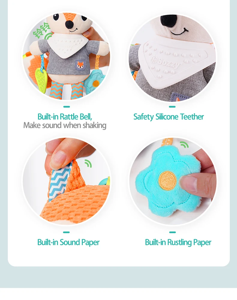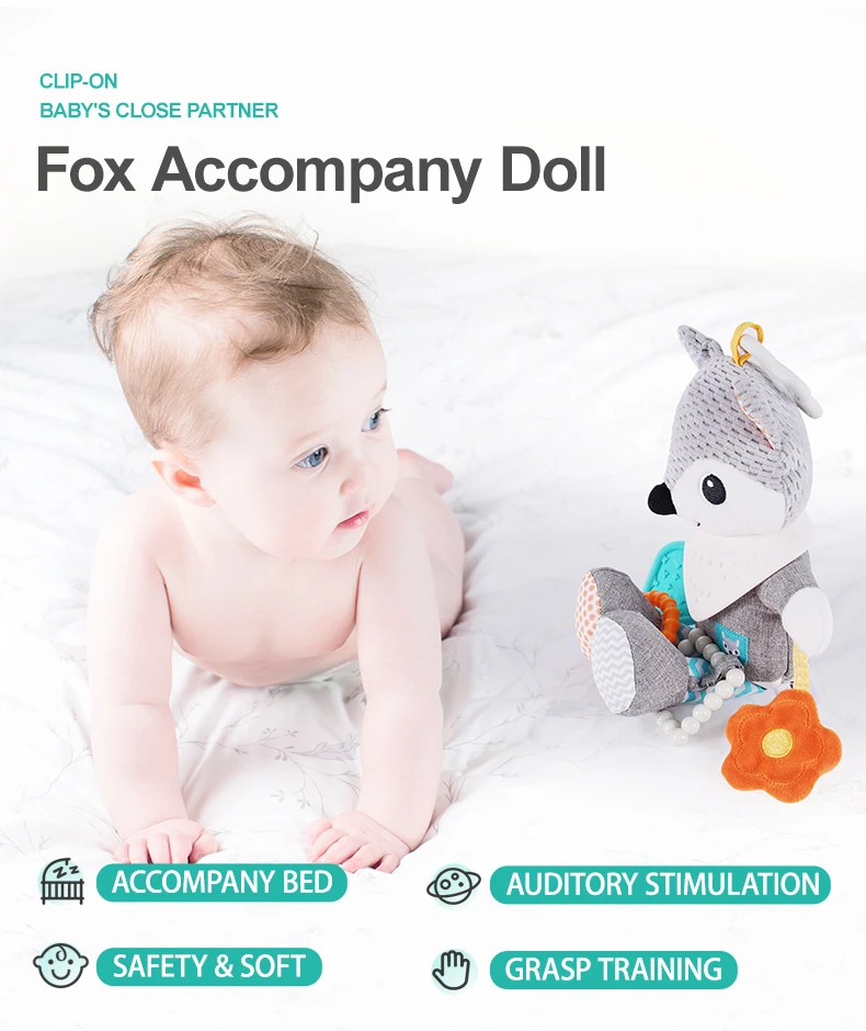 Jollybaby Wholesale Crochet Fox Animals Toy Car Seat Hanging Toys Baby Stroller Rattle with Teether PP Cotton Filling